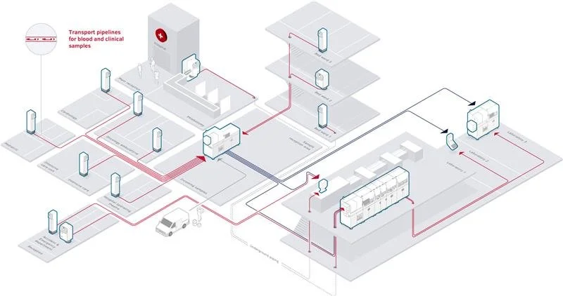 Shows a Tempus1800 vial delivery system transporting materials from icu/emergency/phlebotomy stations (automated workflow) into the lab.